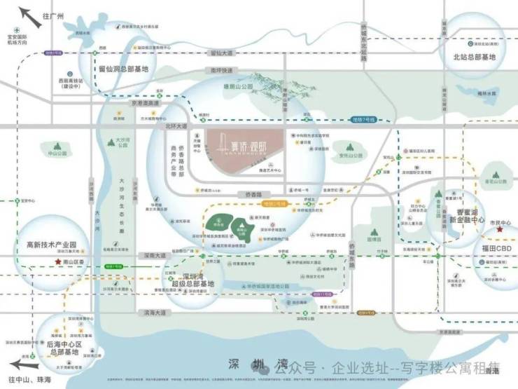 快捷交通路网,北环大道/南坪快速/侨香路/京港澳高速,20-30分钟到福田CBD、深圳北站、皇岗/福田/深圳湾三大口岸、宝安机场等,城芯而居,超享生活。