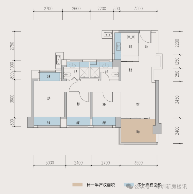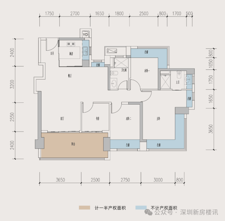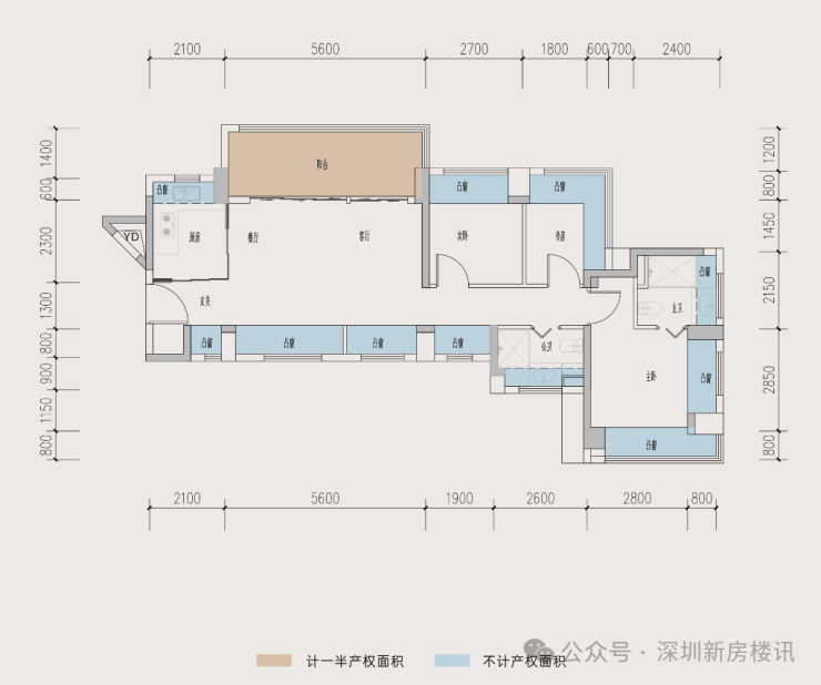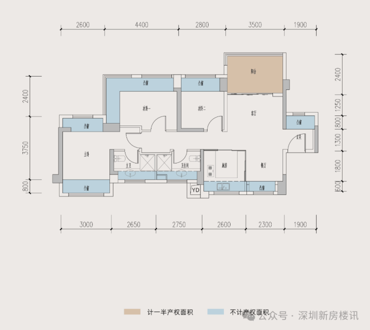 横厅南北通透格局,客餐厅5.6米开间,客餐厅出11㎡的大阳台,主卧+1个次卧双飘窗设计,全屋12面飘窗,3个卧室分别做到了主卧15.1㎡/次卧7.83㎡/次卧6.96㎡(含飘窗),得房率约:77.39%(不含赠送),阳台主朝西北向。也是可以改4房的格局,赠送面积24㎡,加上赠送得房率104.44%。
