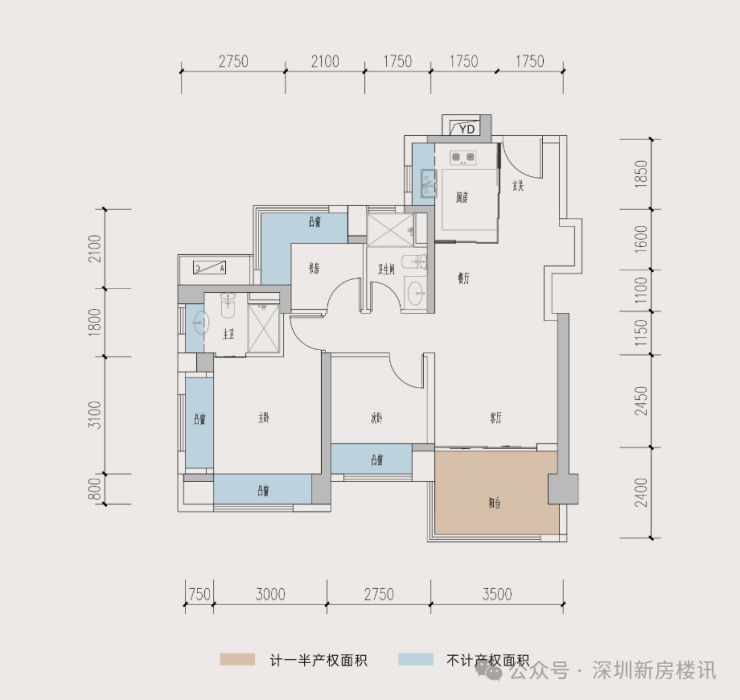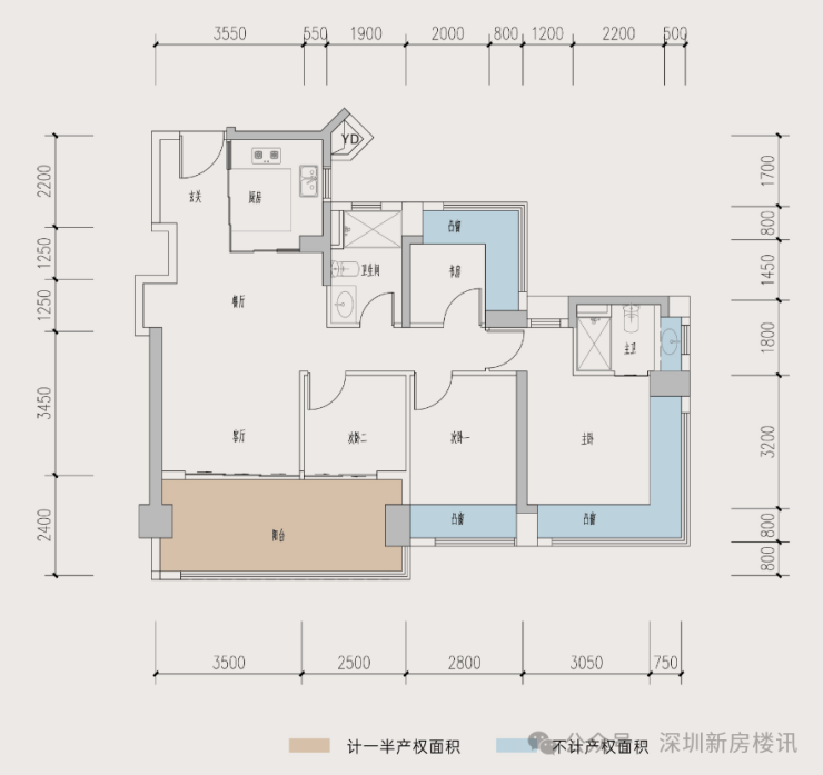 竖厅格局,客厅3.5米开间,三开间朝南,主卧+1个次卧270°飘窗,3个卧室分别做到了主卧15.1㎡/次卧8.52㎡/次卧7.77㎡(含飘窗),得房率约:77.39%(不含赠送),西南朝向。赠送面积16.96㎡,加上赠送得房率96.84%。