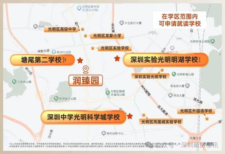 小学学区划分在光明区外国语学校、凤凰城实验学校、光明区实验学校、玉塘学校、龙豪小学;
