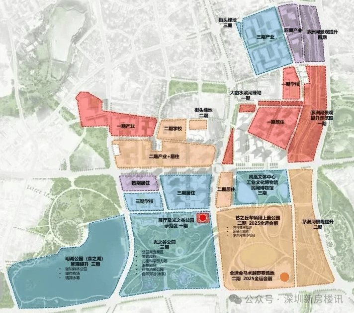 华润润宏城,位于光明区凤凰街道塘尾社区,深圳地铁13号线二期月亮路站(在建)上盖,深圳首个旧改体量建面超300万m²的项目。整体规划容积约380万㎡超大体量城市级,其中住宅约170万㎡,由华润置地和宏发集团联合打造,分多期多地块开发,其中一期就分4个地块开发,前期入市的是润雅园已经基本售罄,还剩少量4房在售,这次润臻园就是1期其中一个地块,后面还有二期三期,另外产业配套也分4期开发打造,还规划有3所九年制学校、2所18班幼儿园,3所12班幼儿园,3所9班幼儿园。