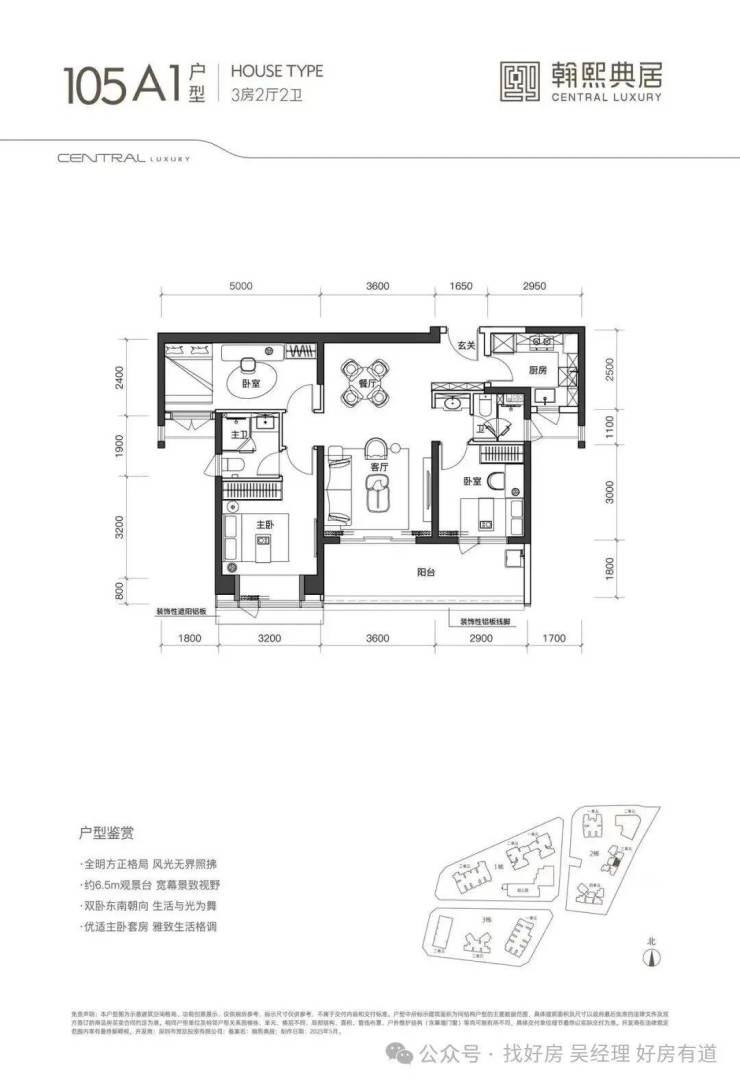 105平A1户型为三房两厅两卫,采用竖厅类双龙抱珠格局,客厅开间达3.6米,客餐厅一体化设计,让公共活动空间更加开阔 。三个卧室布局合理,主卧面积约12.8㎡,次卧分别为12㎡和8.7㎡(包含墙体飘窗) ,居住舒适度高。客厅连接次卧,延伸出6.5米长的宽景大阳台,采光通风俱佳,可尽情享受室外美景 。U型厨房操作便捷,公卫采用三段式分离,提升了使用效率和卫生程度,整体得房率约90%(包含赠送),朝向为东南,阳光充足。
