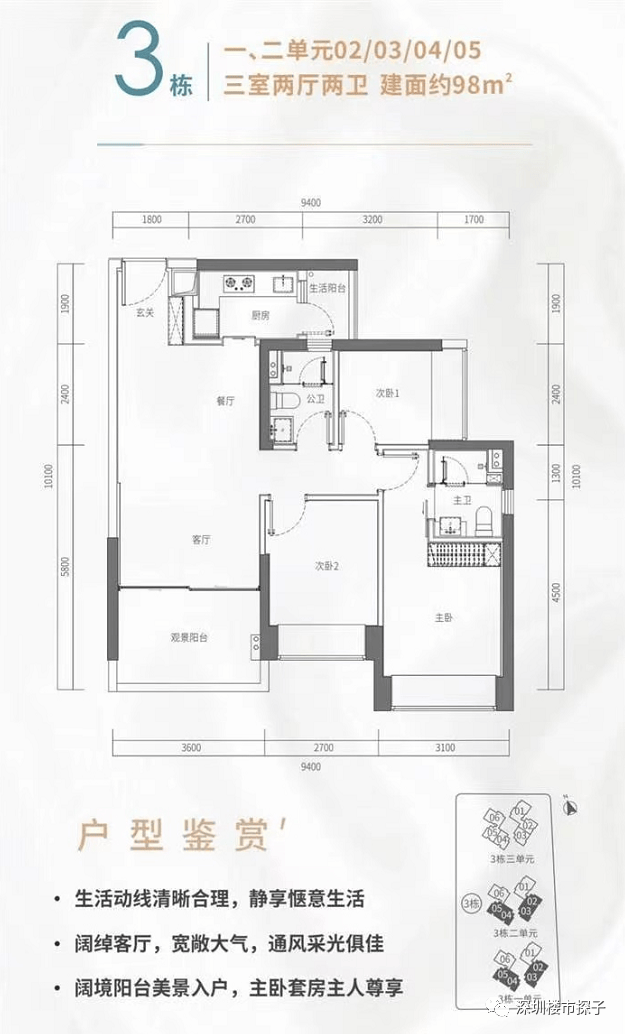约98-121-143平3-5房,户内层高3米,采用一线高端品牌精装交付,即买即入住;3梯6户高效出行,高品质生活保障。