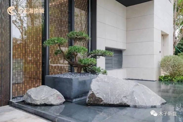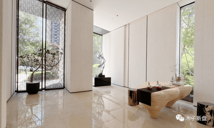 立面主要采用为石材、大铝板与玻璃、真石漆,这种组合搭配常见于南山、福田豪宅项目使用,历久弥新。园林设计师是日本户田芳树,布置有罗汉松、小叶紫檀等名贵树种。