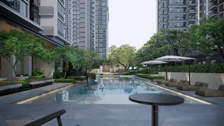 约400㎡复合泳池串联了水岸聚会廊下空间,打造游泳与家庭遛娃双核场所,在游泳的同时也能感觉惬意放松,也方便家长照护孩童并促进邻里交流。