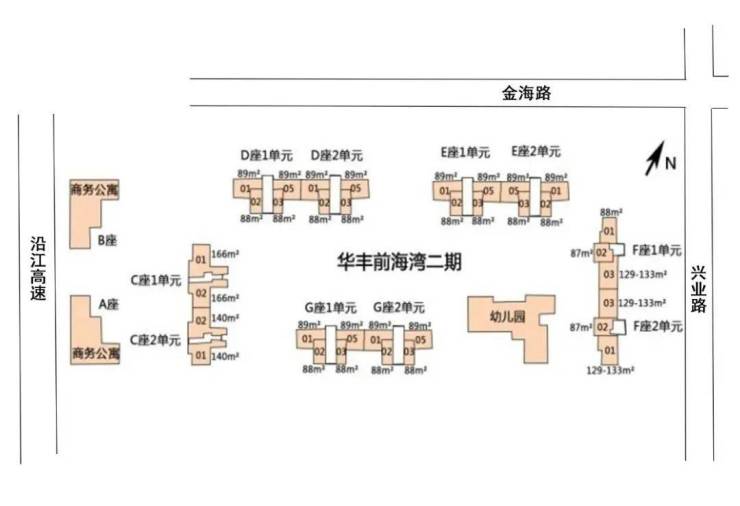 二期由7座楼栋组成,分为A/B/C/D/E/F/G座,A/B座为公寓,其他楼栋均为住宅。E/G座于2020年交付,都是总高31层的高层住宅,E座2梯4户,G座2梯3户,主打89平的三房。
