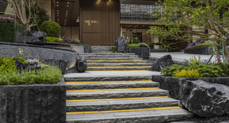 整个园林以山-林-水-石为赏景流线,设置沿阶花池、水景小品、以及雕塑跌水循环水景等区域,加工工艺与材料处理极度考究。更难以置信的是,为了营造满级的归家仪式感和尊崇感,项目重金甄选罗汉松、铁冬青等名贵树种,进行100%全冠移植,打造的独具一格的大师园林。