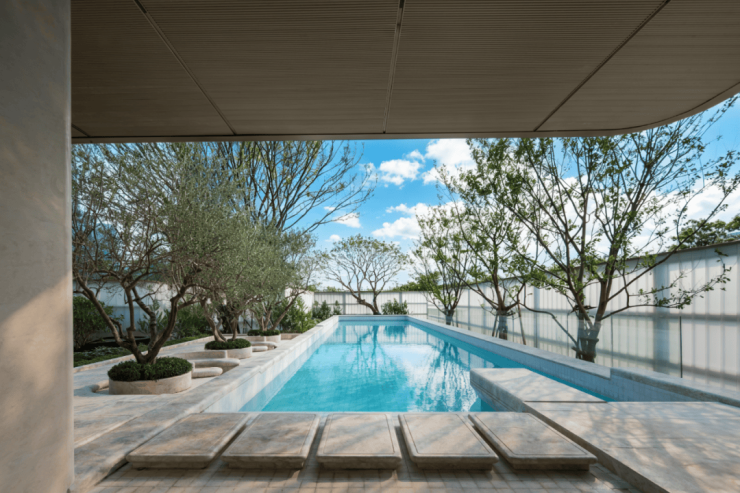 泳池前面就提了一下,暹罗白大理石打底,明亮的白色基底上,浅灰色的天然纹理若隐若现,像水墨在宣纸上轻轻晕开。池畔三棵南法风景的油橄榄,苍劲、松弛,带着地中海阳光的味道,拥享南法度假般体验。