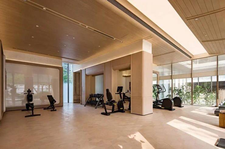 健身区直接采用的是“健身界的劳斯莱斯”泰诺健设备,一台设备抵别人一整套,手感、精度、耐用度都是塔尖级,一般五星酒店才会用。室内设计上采用大面积落地窗+室内木饰面,在跑步机上挥汗如雨的时候,眼前不是冰冷的器械墙,而是窗外的风景和绿意。