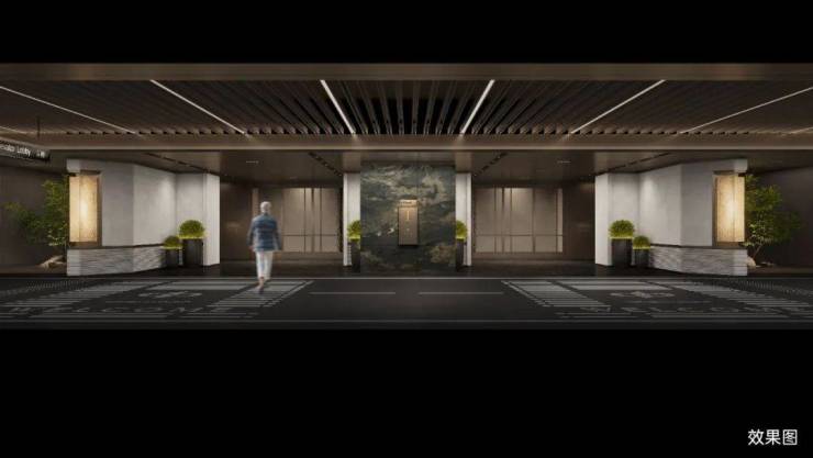 车库双大堂设计,大面积采用天然浅色石材,并于天然奢石加以点缀,光厅顶面采用金属构件,结合灯带,增加层次感,彰显项目高定品质。