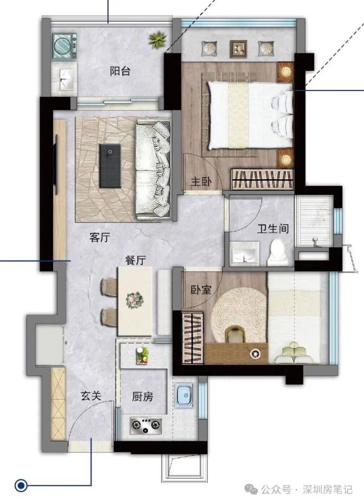 63㎡两房一卫:这是最小面积段,总价212-235万。竖厅设计,客厅3米开间,有入户玄关八宝库,LDKB一体化,U型厨房,卫生间干湿分离。适合刚需上车或者投资出租。这个户型西北朝向,虽然朝向一般,但总价低啊,首付32万起就能上车,还要什么自行车。
