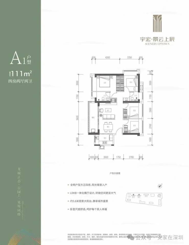 111㎡的4房2厅2卫,设计的是横厅南北通透格局,客餐厅5.6米开间,LDKB一体化,五开间朝南,4个卧室分别做到了3米/3米/2.9米/2.7米的宽度,客厅连接餐厅位出5.6米长的大阳台,L型厨房,公卫生三段式分离,得房率约76%(不含赠送),阳台主朝西南向。