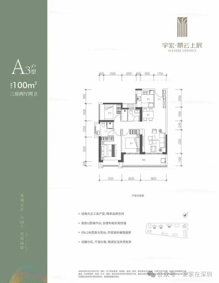 100㎡的3房2厅2卫,设计的是竖厅格局,客厅3.6米开间,LDKB一体化,三开间朝南,3个卧室分别做到了3.1米/2.6米/2.4米的宽度,客厅连接次卧出6.2米长的大阳台,U型厨房,卫生间干湿分离,得房率约76%(不含赠送),东南朝向。
