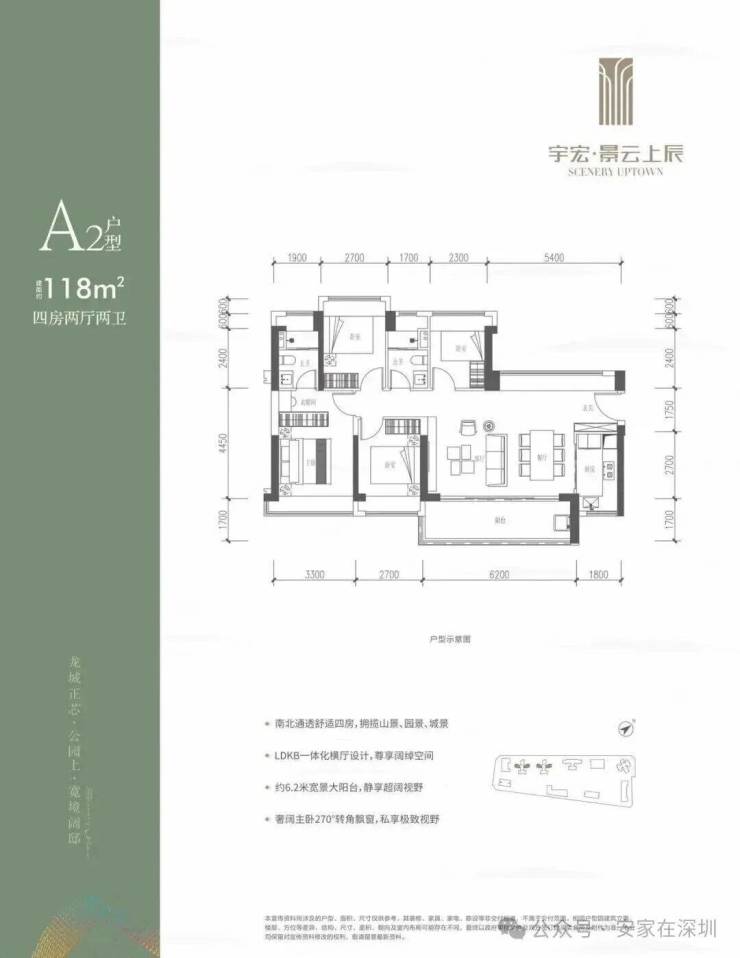 118㎡的4房2厅2卫,设计的是横厅南北通透格局,客餐厅6.2米开间,LDKB一体化,五开间朝南,西北面5.4米长的观景大飘窗,4个卧室分别做到了3.3米/2.7米/2.7米/2.3米的宽度,客厅连接餐厅位出6.2米长的大阳台,L型厨房,卫生间干湿分离,得房率约76%(不含赠送),东南朝向。