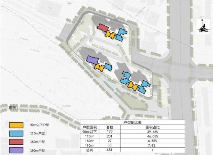 规划总户数433户,整体布局2梯4户,2梯5户,2梯6户。