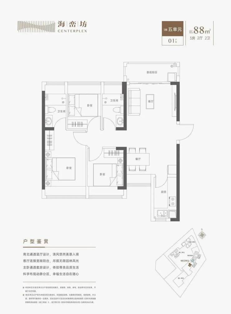 88㎡南北通的户型,分布在5单元的01和02,客厅西北向看花园,主卧东南向看凤凰天誉。88㎡横厅户型分布在2单元的01和02,东南朝向,餐厅视野会受楼体部分遮挡。