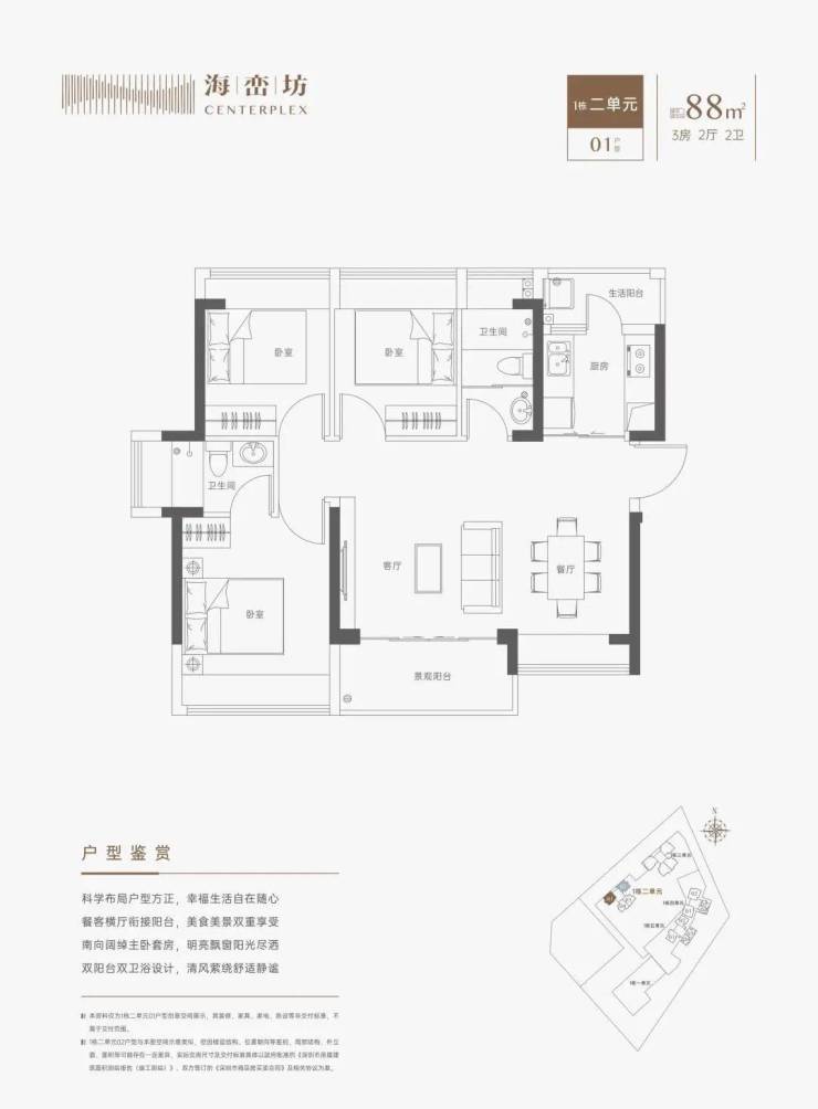 88㎡的3房2厅2卫(1栋2单元01户型),设计的是横厅南北通透格局,进门独立玄关,全屋飘窗,三开间朝南,U型厨房,得房率:73.88%(不含赠送),阳台主朝东南向。