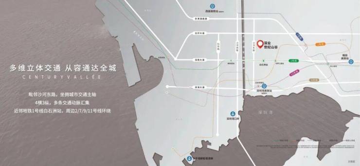 五轨四横三纵多枢纽:项目毗邻沙河东路,950米达深南大道;驾车1.5公里进入北环大道,坐拥城市交通主轴,与总部经济圈紧密相连,近邻地铁1号线白石洲站,1站到达高新园,周边五轨环绕,纵横湾区主场,从容通达世界。