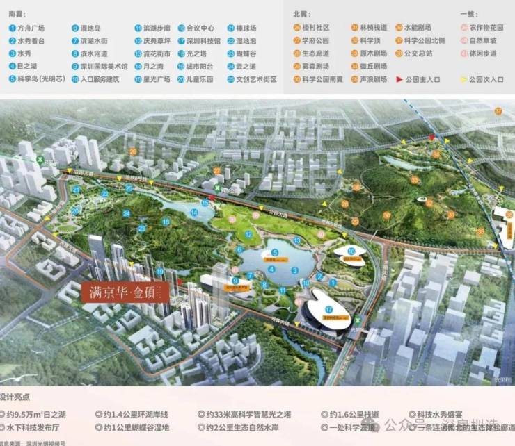 满京华金硕悦府,位于深圳光明中心区核心位置,紧邻光明科学城这一国家级科技创新枢纽,坐拥科学公园首排景观(占地约208万平方米),是光明科学环廊的重要组成部分,片区定位为深圳北部新中心,依托光明科学城的科研产业规划,未来将聚集大量高端人才与资源,区域发展潜力突出。