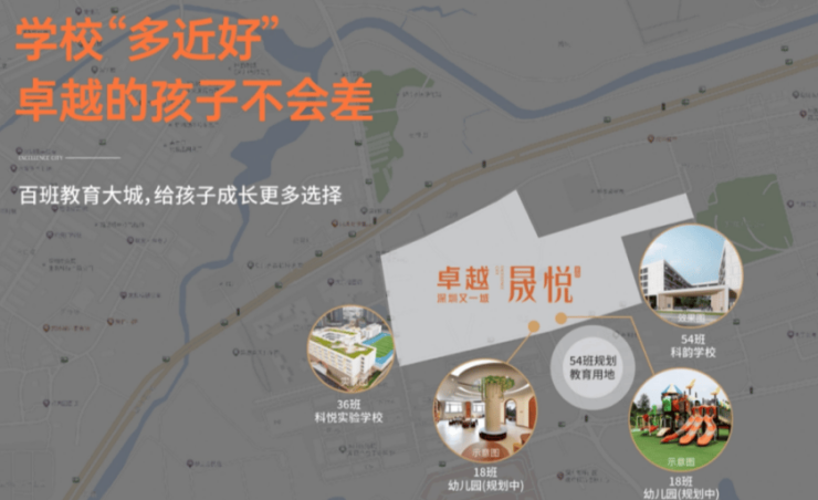 项目自带2所18班幼儿园,周边科韵学校,该校是一所九年制45班公办学校,周边还有科悦小学(30班,已开学),科源实验学校(九年制42班公办学校)、深实验坪山分校(初中)