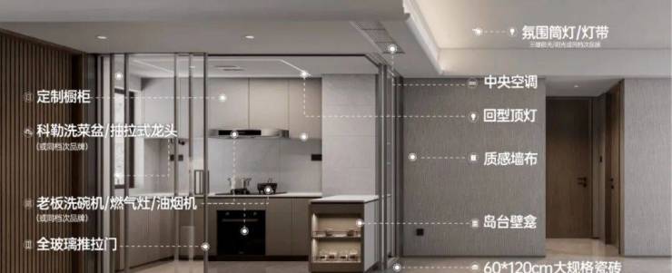 入户赠送收纳功能强大的玄关柜,厨房天花采用石膏板+回型灯设计,客餐厅天花弧形吊顶、地面采用大地砖,造价更高、更耗时耗力,也更美观。