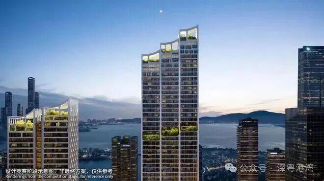 后海沄玺花园旨在打造城市次地标,设计灵感来自植物细胞的有机形态。项目由五座150-250米塔楼组成,采用错落布局和平面退台设计,以优化深圳湾景观视野。