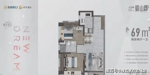 69㎡的2房2厅1卫设计的是竖厅格局,客餐厅一体化,L型厨房,得房率:70.9%(不含赠送),阳台西南朝向。