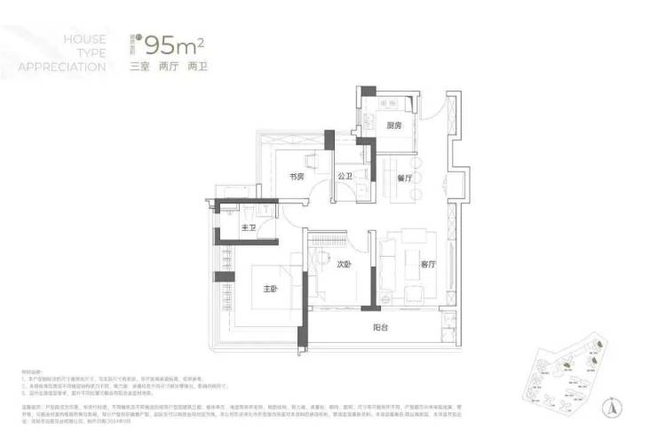 95㎡的3房2厅2卫:传统竖厅格局,客厅开间3.5米,LDKB一体化,S墙设计预留冰箱卡槽位,3个卧室分别做到了3.6米/2.8米/2.8米的宽度,主卧加1个次卧270°全景飘窗,客厅连接次卧出6.3米长的大阳台,U型厨房,得房率约95-97%(包含赠送),西南或东北朝向。户型分布在2栋2/3单元04/05户型,东北朝向看大南山、2栋1单元04/05户型西南朝向看小区;