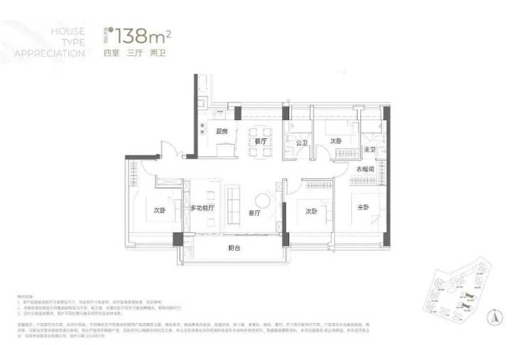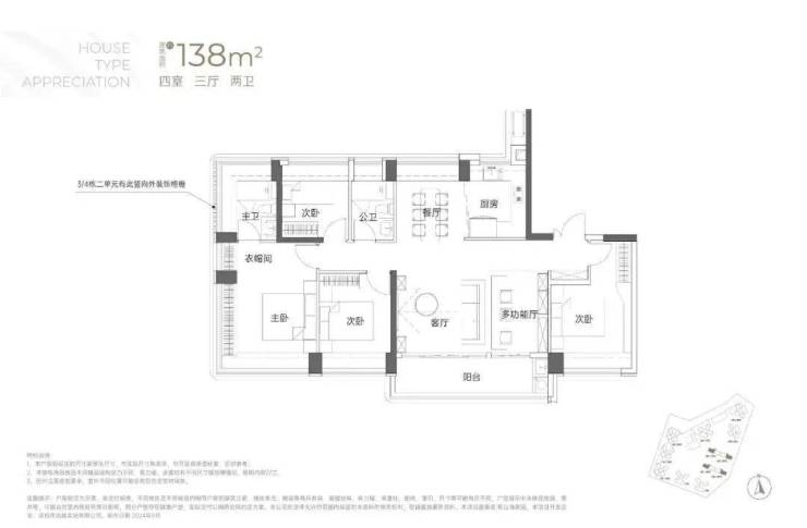 138㎡的4房2厅2卫:竖厅南北通透格局,专梯入户,客厅6.1米开间,LDKB一体化,全屋飘窗,4个卧室分别做到了3.9米/3.25米/2.9米/2.8米的宽度,主卧加1个次卧270°全景飘窗,客厅出6.1米长的大阳台,U型厨房,得房率约95-97%(包含赠送),阳台主朝西南向。138平米户型分布在3栋1单元、3栋2单元、4栋1单元、4栋2单,4个单元纯大户型。