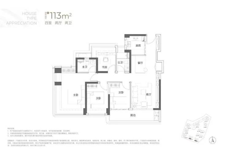 建面113平米:4房2厅2卫,传统的竖厅户型动静分区,‘S’型墙体,有冰箱预留位;市面非常常见的竖厅4房户型,比较突出的是有大阳台连接客厅和次卧;主卧和书房(卧室)都是多飘窗设计,保证了视野和多方面的采光;这种户型的缺点是走廊过长,空间利用率比横厅或者双龙抱珠户型差些;户型分布在5栋、6栋03/04户型,均是西南朝向,看小区外面大南山方向,比较安静;