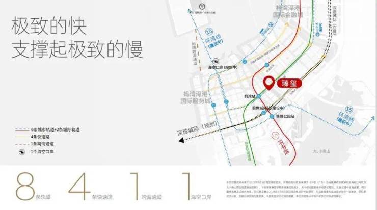 深圳招商前海瑧玺周边共规划6条地铁线、2条城际轨道、1条妈湾跨海隧道及1个海空口岸。距5号线妈湾站约500m,梦海大道贯穿前海、可短时间通达南山、福田、宝安,快速对接大湾区生活圈,便利通达整个亚洲