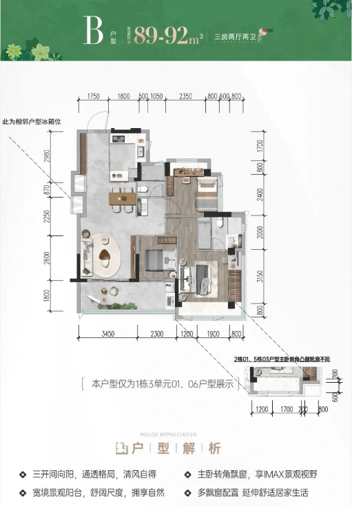 B户型89-92㎡3房2卫竖厅