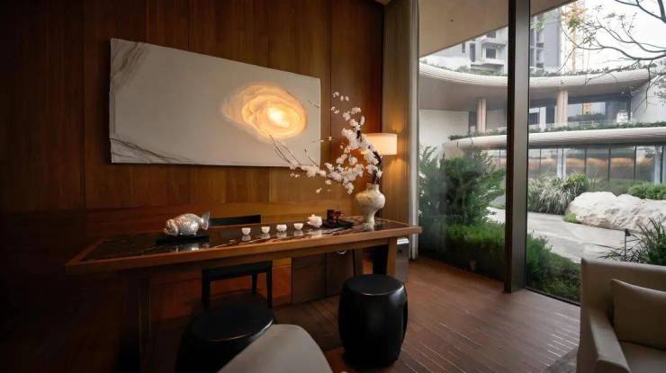 项目核心景观为5.5 万㎡三层立体台地园林,展示区即中央下沉庭院,是整个社区景观灵魂,设计理念:一心十岛、浮屿藏海、山谷秘境。展示区采用双下沉山谷式设计,区别于平面园林,利用场地高差打造高低错落、内外通透的立体景观;中央约 800㎡镜面无边水景,模拟前海潮汐海面,是展示区视觉核心;整体抬地 12 米(三层架空底盘),住宅首层相当于市政地面三层高度,完全避开道路噪音、俯瞰园林海景。全冠移植名贵乔木、多层次乔灌草,滨海耐盐树种,营造森海秘境氛围;大面积弧形石材、水洗石、木纹铝板,柔和曲线呼应海浪形态,拒绝生硬直角。
