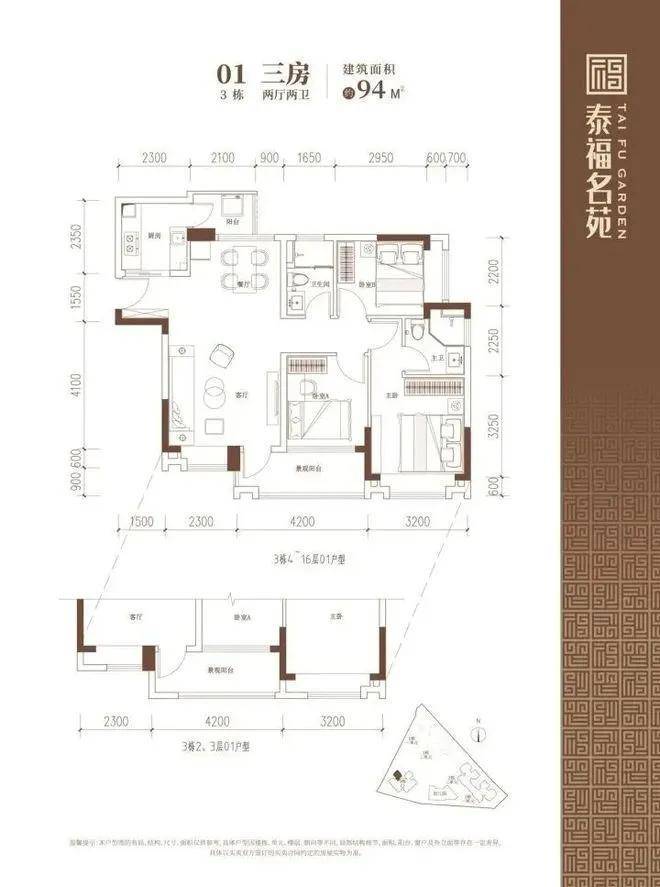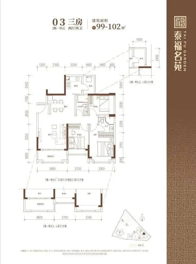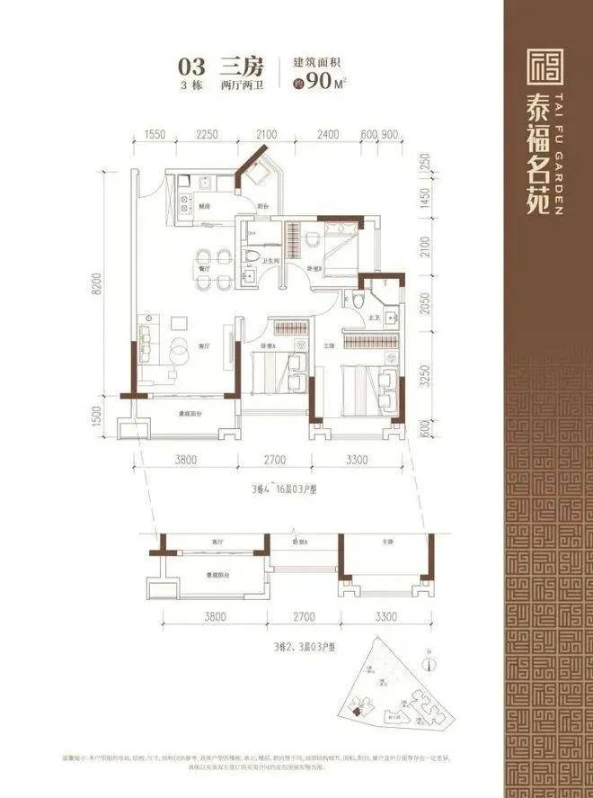 90-102㎡的3房2厅2卫户型。这几个户型都是在主人房多设计一个卫生间,私密性更强,也让家人间的生活更加方便。