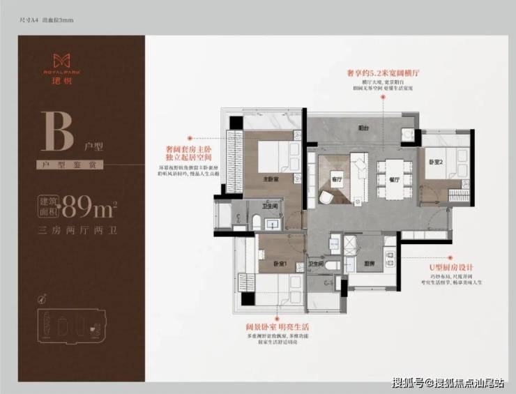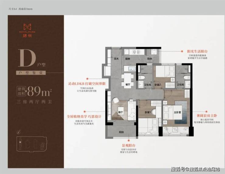 89㎡三房二卫A/B户型,位于1栋一单元,两开间阳台,主卧都有双面凸窗赠送。