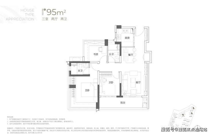 95㎡的3房2厅2卫:传统竖厅格局,客厅开间3.5米,LDKB一体化,S墙设计预留冰箱卡槽位,3个卧室分别做到了3.6米/2.8米/2.8米的宽度,主卧加1个次卧270°全景飘窗,客厅连接次卧出6.3米长的大阳台,U型厨房,得房率约95-97%(包含赠送),西南或东北朝向。户型分布在2栋2/3单元04/05户型,东北朝向看大南山、2栋1单元04/05户型西南朝向看小区;