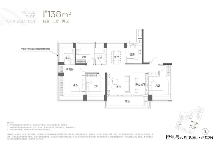 138㎡的4房2厅2卫:竖厅南北通透格局,专梯入户,客厅6.1米开间,LDKB一体化,全屋飘窗,4个卧室分别做到了3.9米/3.25米/2.9米/2.8米的宽度,主卧加1个次卧270°全景飘窗,客厅出6.1米长的大阳台,U型厨房,得房率约95-97%(包含赠送),阳台主朝西南向。138平米户型分布在3栋1单元、3栋2单元、4栋1单元、4栋2单,4个单元纯大户型。