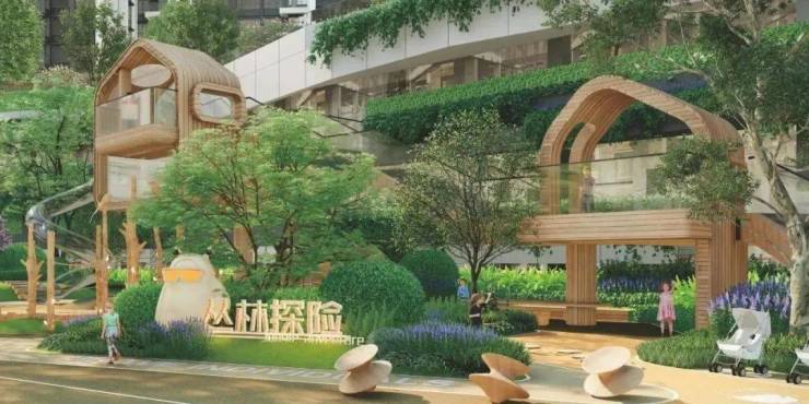 小区还对标了五星级酒店会所标准打造了约600㎡的泳池会所,配备了约10米长的儿童泳池与45米长的成人泳池,且配建了瞭望塔、树屋、攀岩墙、健身天地、功能球场等配套设施。