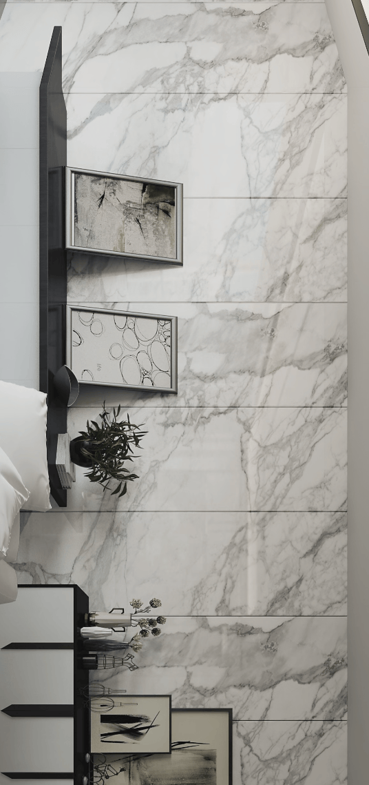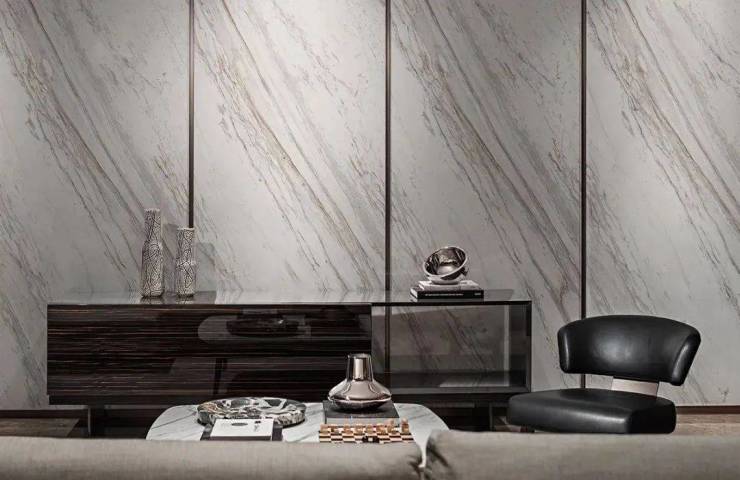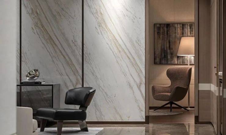 客厅定制的地板为迪奥金,电视背景墙石材则是金纹爵士白。