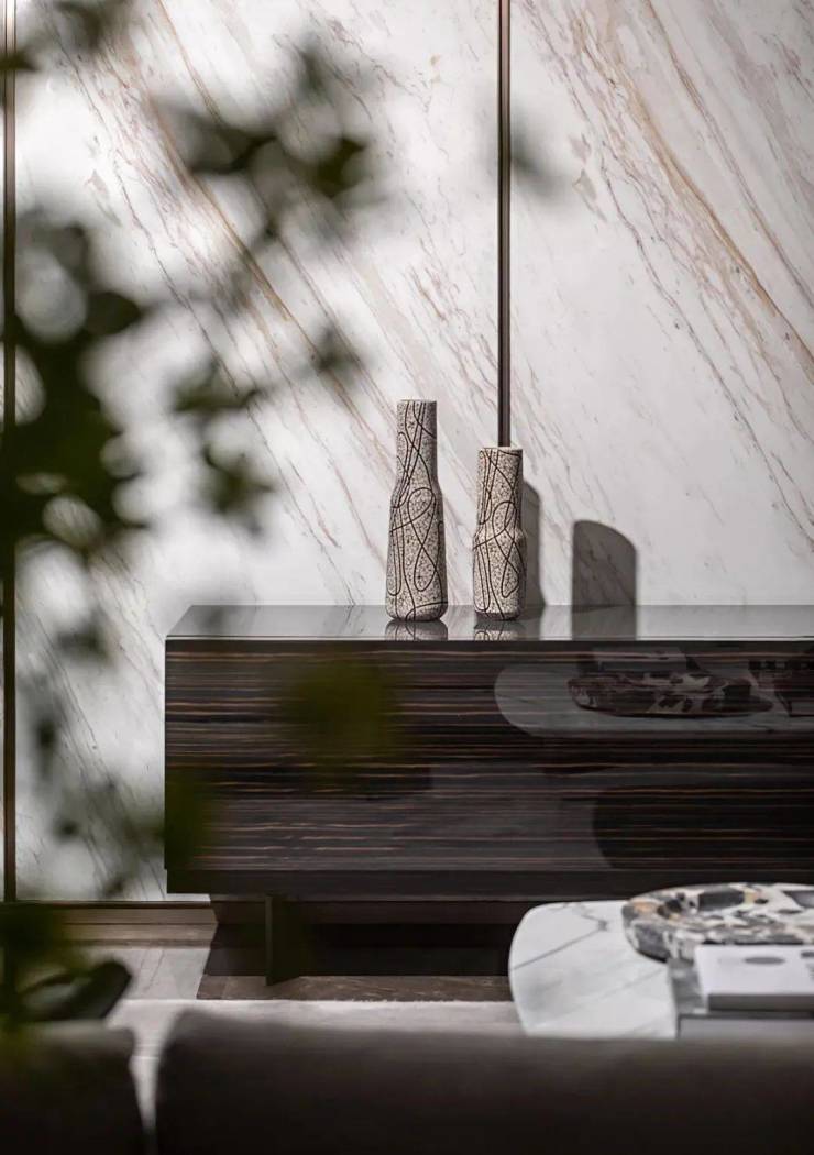 空间中采用光滑的和现代的材质以保持与建筑一致,并在不同材料的大胆混合中,展现独特的奢华气质。