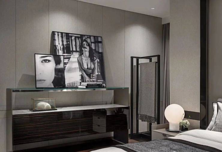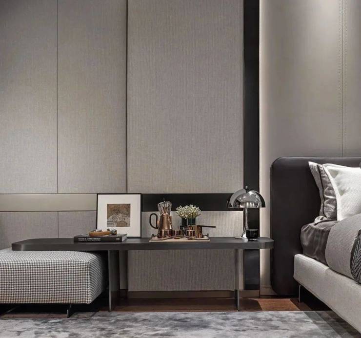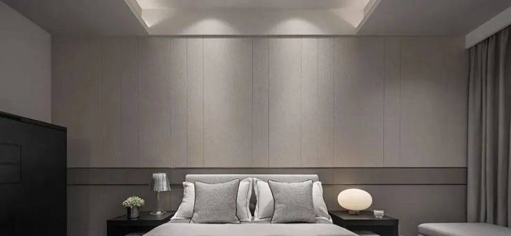被定制的床头如米色的大理石质感般环绕。用料方面真的不惜工本,才能营造出奢华典雅的睡眠空间。