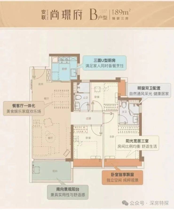 安联尚璟府位于光明区新湖街道科学公园旁,项目总占地约1.8万㎡,总建筑面积约9.2万㎡,容积率3.8,项目共由4栋住宅组成,其中A/B/C座是商品房,全部两梯四户,户户朝南,D栋是人才房,配建有一所18班幼儿园,项目自带3000平商业;