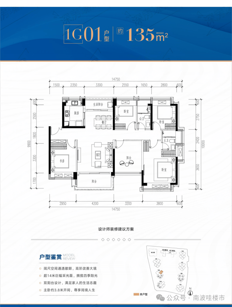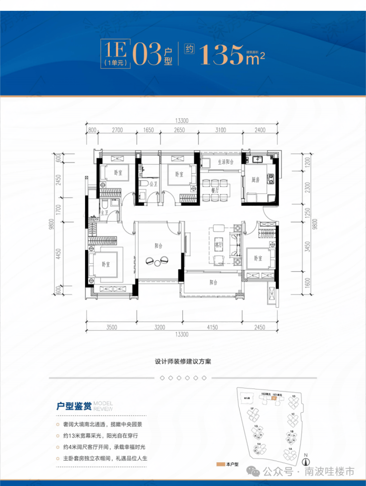 135平5房2卫,南北通透双阳台,东南朝向看花园,赠送面积21.51-21.8㎡,加赠送得房率约95.56-95.78%。