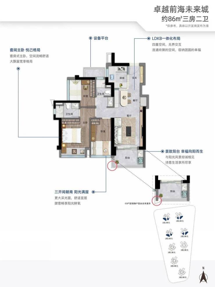86㎡的3房2厅2卫,折后总价313-324万/套,折后单价3.63-3.73万/㎡。