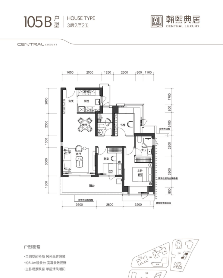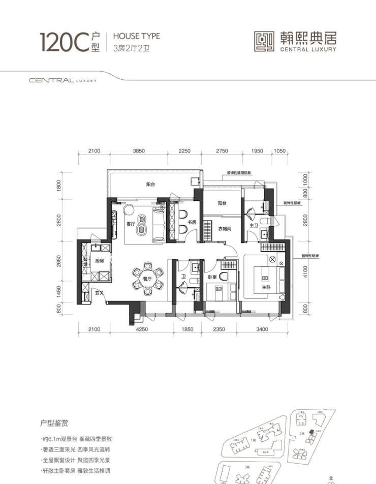 该户型为 02 地块的唯一一条腿,非常稀缺。户型南北通透,带大主卧套房的奢居型三房。带 5.4m 观景台,大横厅奢阔空间设计,主卧同客厅阳台、餐厅三面宽朝西南。北向双次卧、双卫生间、拓展空间共五面宽一字排开,视野全面俯瞰社区内园林,静谧舒适。