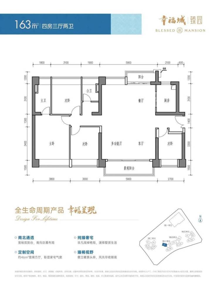 163㎡的4房3厅2卫,设计的是横厅南北通透格局,进门入户玄关,客厅5.9米开间,餐厨一体化设计,南北双阳台,全屋7个飘窗面,4个卧室分别做到了主卧20.14㎡/次卧12㎡/次卧11.47㎡/次卧10.43㎡(包含墙体飘窗),客厅出5.9米长的观景大阳台,U型厨房,公卫三段式分离,得房率约88.25%(包含赠送),阳台主朝西南向。
