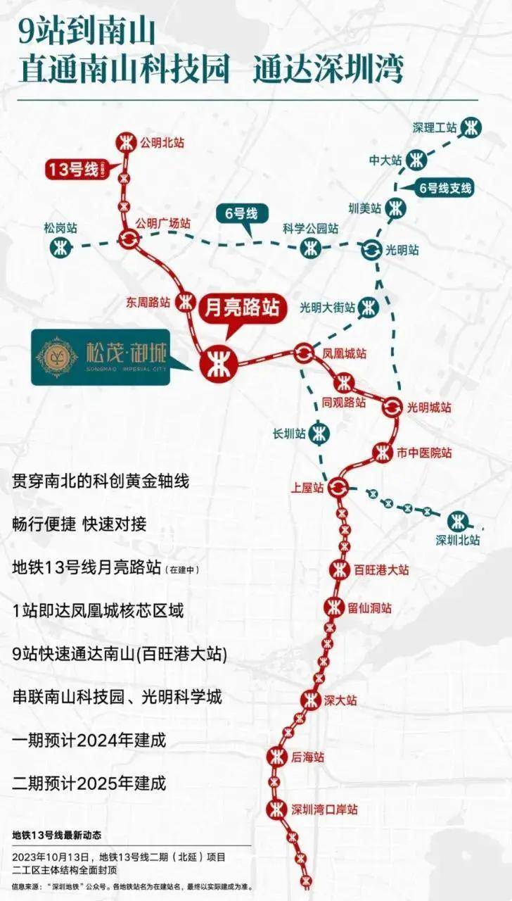 松茂御城紧挨着松白路主干道,周边还有东明大道,光明大道,沈海高速,深圳外环高速,南光高速,龙大高速等交通要道,目前距离在建的13号地铁线“月亮路站”约400米,3站到光明城站,5站到石岩上屋站,计划在2025年通车运营。