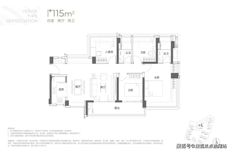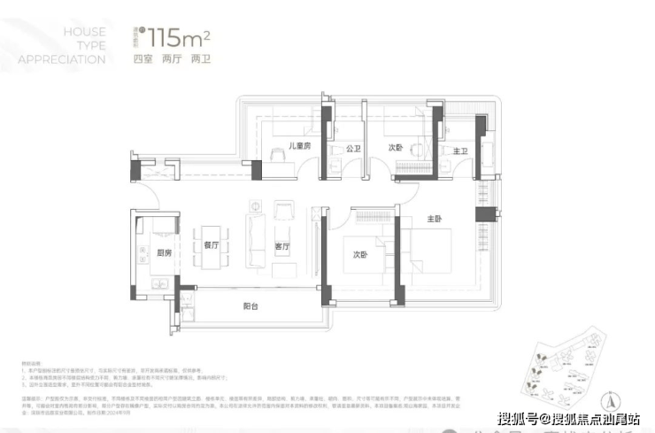 115㎡的4房2厅2卫:横厅南北通透格局,客餐厅6米开间,LDKB一体化,全屋飘窗,4个卧室分别做到了3.9米/3米/2.8米/2.6米的宽度,主卧加1个次卧270°全景飘窗,客厅出6米长的大阳台,L型厨房,得房率约95-97%(包含赠送),西南或东南朝向。115平米户型分布在1栋1单元、1栋2单元、1栋3单元01/02户型,01户型西南朝向都是看小区外围,02户型看向小区;