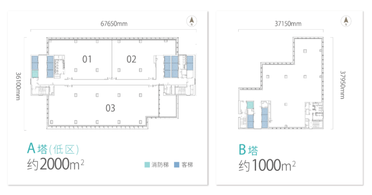 标准层面积:A塔约1900-2300㎡(使用率70%)