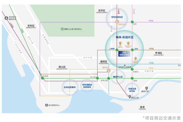 创智云中心位于福田中心区以北,15分钟可达深圳北站、福田高铁站两大湾区核心枢纽;40分钟可达深圳宝安国际机场;项目步行500米可达上梅林、孖岭地铁站,步行5分钟可达卓悦汇大型购物广场及国际体育文化交流中心。